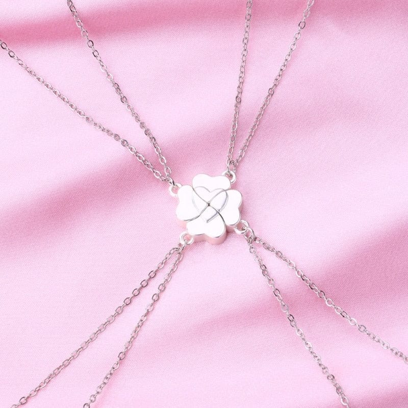 Bringen Sie Glück in Ihre Freundschaft und halten Sie Ihre Freundinnen immer in Ihrer Nähe mit diesem Set aus 4 Ketten, die zusammen ein hübsches kleines vierblättriges Kleeblatt ergeben. Ein Schmuckstück voller Symbolik, das Ihren besten Freundinnen (BFF) leuchtende Augen bescheren wird. Diese Kette ist nicht nur ein modisches Accessoire, sondern auch ein Symbol für Glück und Zusammenhalt. Hergestellt aus einem sehr widerstandsfähigen Zinklegierung, ist sie sowohl verschleiß- als auch stoßfest. Mit einer Kettenlänge von 45 + 5 cm und einem Anhänger von ca. 2,2 cm ist sie perfekt für den täglichen Gebrauch geeignet.